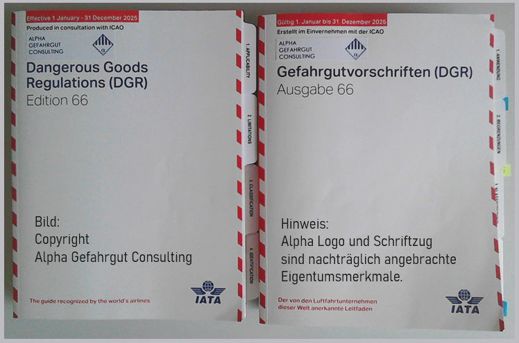 Das Bild zeigt die IATA-DGR (66. Ausgabe) in deutscher und englischer Ausgabe mit Eigentumsmerkmalen der Alpha Gefahrgut Consulting